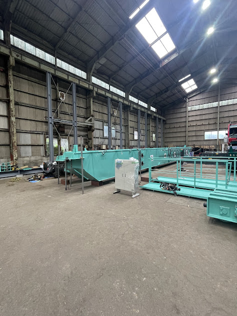 付属機器の仮置き:ホイストやトロリ関連の重機は、地組段階で仮置きしてフィット感を確認(本取り付けは上架時)。